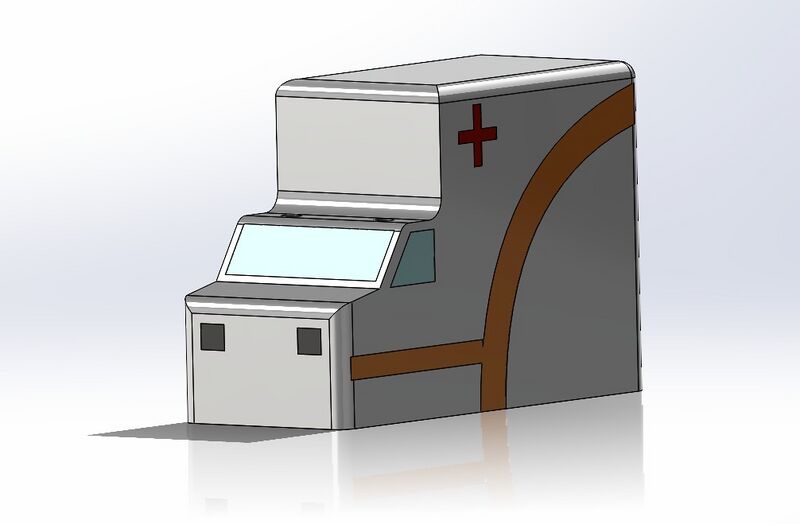 Der Krankenwagen wurde eigenhändig in SolidWorks konstruiert und anschließend 3D-gedruckt. Von außen ist der Krankenwagen mit einem schlichten Design versehen. Von innen ist der Krankenwagen hohl, damit die Schaltung für die blinkende Lichtanlage sowie für die Erkennung des Krankenwagens auf der Straße Platz findet. Der untere Deckel sitzt passgenau in dem Körper des Krankenwagens und wird mit vier Schrauben fixiert. Auf der Hinterseite befindet sich ein Loch für den Schalter der Schaltung. Das tatsächliche Design weicht leicht von der CAD-Datei ab, da Probleme beim 3D-Drucken aufgetreten sind.