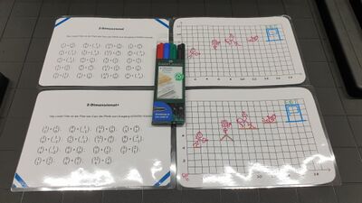 Für 2-Dimensional wird in Illustrator das Koordinatensystem aufgezeichnet, mit X- und Y-Achse. Dazu kommen die Maße, das Feldmuster/-raster, ein paar Caros als Strichmännchen mit Bogen und Pfeil und ein Ausgang. Damit der Weg zum Ausgang entsteht, braucht man die Vektoren dazu, die dann entsprechend in Word eingetippt wurden. Sind die Dokumente fertig, so werden die auf Papier dann ausgedruckt. Und damit sie nicht bei schlechter Witterung ruiniert werden, werden die Dokumente noch in Folie laminiert, sodass es wasserfest und knickfrei bleibt. Somit ist es fertig und mit Folienstiften können dann die gefragten Vektoren eingezeichnet werden.