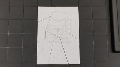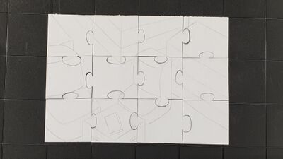 Für die Puzzle-Reise werden die Puzzleteile, sowie die Fake-Bücher, aus dem Sperrholz geschnitten. Danach können die Bücher mit Kleber und Scharniere, damit die auf- und zugeklappt werden können, zusammengebaut werden. Innendrin werden die Zahlen für den Code mit Edding reingeschrieben. Die beiden Bücher werden an ihre Orte (Sofa-Ecke der Bücherei & Bücherregal im Mensaflur) gebracht und ein Foto wird gemacht wie die Bücher dort liegen. Diese Bilder werden in Photoshop schwarz/weiß umgefärbt und mit einer Ebenenmaske kann das Buch farblich markiert werden. Beide Bilder mit den Büchern werden auf ein DIN A4 Blatt platziert und als Dokument exportiert und ausgedruckt. Das Dokument wird aufgeteilt und einlaminiert. Nachdem auch die Puzzleteile ausgesägt wurden, werden die laminierten Bilder in ihre Teile zerschnitten und auf ihre Formen aufgeklebt. So hat man das erste Puzzle zum lösen, welches zum ersten Buch führt, welches wiederum eine Codehälfte und das zweite puzzle enthält, welches dann zum letzten Buch mit der anderen Codehälfte führt.
