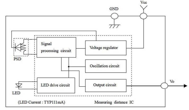 Messaufbau des SHARP IR GP2Y0A41SK0F Quelle: https://global.sharp/products/device/lineup/data/pdf/datasheet/gp2y0a41sk_e.pdf