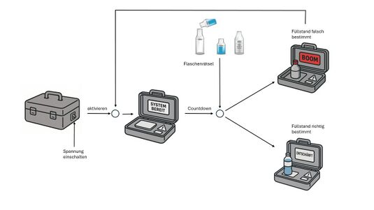 Das zentrale Element der Interaktion ist eine Wägezelle, die das Gewicht einer mit Wasser gefüllten Flasche auf einer speziellen Wiegeplatte innerhalb des Koffers misst. Das gemessene Gewicht wird vom Mikrocontroller mit einem vordefinierten Zielwert von 200 ml verglichen. Das Ergebnis dieser Prüfung wird als boolesche Variable ausgegeben: 0 bedeutet, dass das Rätsel nicht erfolgreich gelöst wurde, 1 signalisiert den Erfolg.