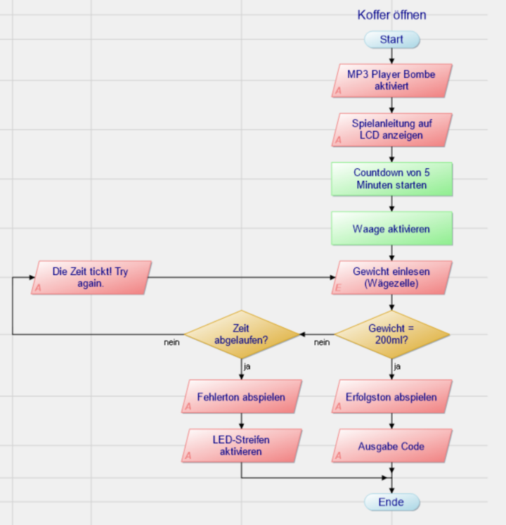Die Spieler erhalten nur einen Versuch, das korrekte Gewicht auf die Platte zu legen. Bei einem Fehlschlag wird ein roter LED-Streifen aktiviert, der eine Explosion simuliert, begleitet von einem akustischen Misserfolgston. Wird das Zielgewicht exakt erreicht, zeigt das LCD-Display eine Wortkombination an, aus der die Spieler einen Zahlencode ableiten können. Gleichzeitig ertönt ein Erfolgssound. Die gesamte Steuerung wird über einen Mikrocontroller realisiert, der die Sensoren (Wägezelle, mechanischer Taster) ausliest, den Countdown steuert, die Displayanzeige verwaltet, die LED-Streifen ansteuert und die Soundausgabe koordiniert.