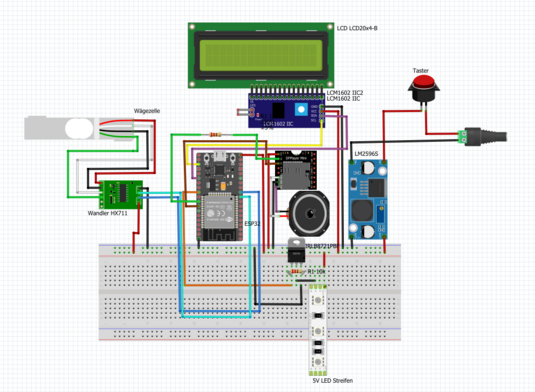 Der Mikrocontroller, der die gesamte Steuerung übernimmt, ist der ESP32 (U1). Er ist mit den Modulen wie dem Display, dem Lautsprecher und der Wägezelle verbunden.