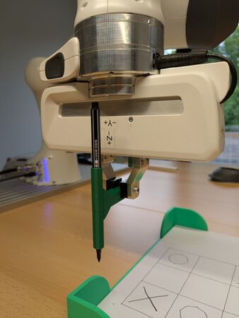 Hier bin ich final auf TicTacToe gekommen, da außer zwei Stiften und etwas Papier nichts weiter an Verbrauchsmaterial benötigt wird, und dies lässt sich in der Größenordnung, die für einen vollen Tag Betrieb gebraucht wird direkt am Roboter lagern, es muss nur ggf alle 2h das Papier etwas aufgefüllt werden, was die Logistik sehr einfach gestaltet.
