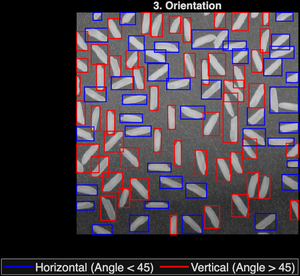 - Orientation: The angle (in degrees ranging from -90 to 90) between the x-axis and the major axis of the ellipse that fits the region. (Useful for alignment detection).