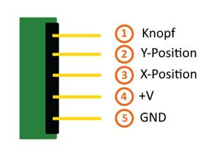 Der hier zum Einsatz kommende Joystick hat zwei analoge Achsen in denen jeweils ein Poti verbaut ist und einen Schalter, den man durch drücken des Joysticks aktivieren kann.