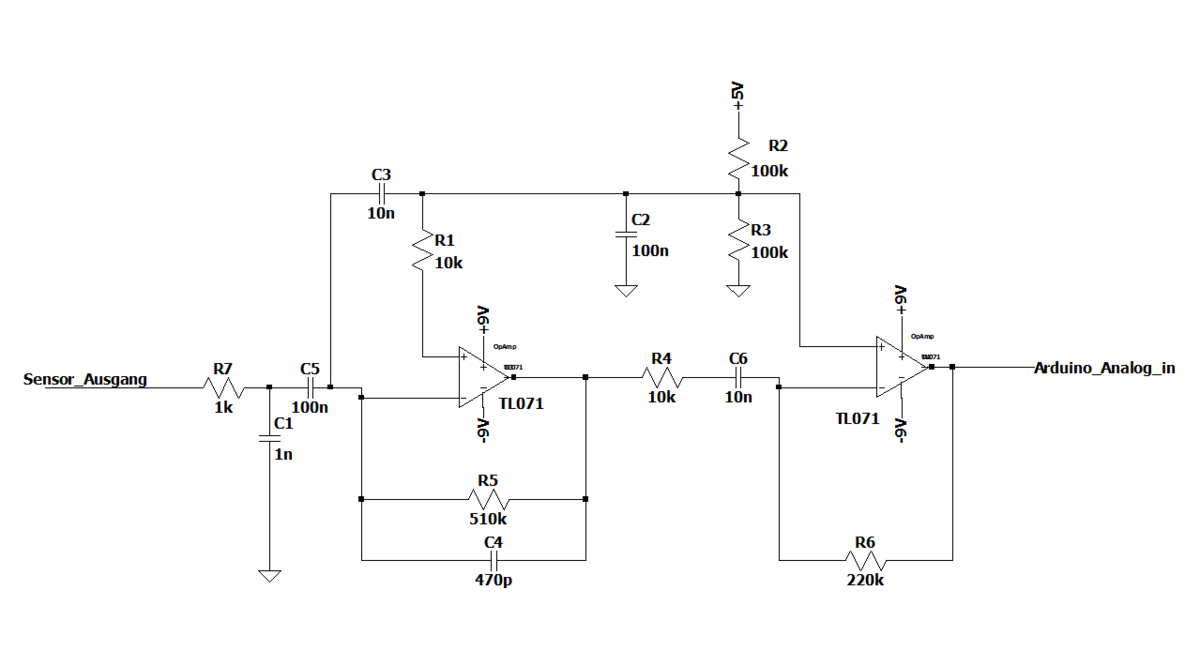 Deswegen wurde einer Verstärkerschaltung aufgebaut, mit zwei Operationsverstärker. Dabei wird zuerst der Gleichanteil des Signales herausgefiltert durch den Kondensator am Eingang.