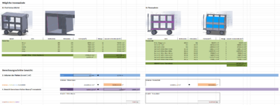 • Im Kapitel Solid Works (Educational Escape Game 1.0) und Power Point wird die erste CAD-Modellierung des Escape-Box-Aufbaus dokumentiert. Ausgangspunkt war ein Rahmen aus 40×40-Aluminiumprofil mit mehreren Varianten (einfacher Aufbau, abgewinkeltes Heck, unterschiedlich große Fächer). Im weiteren Verlauf entfiel das Aluminiumprofil, und die Fächer wurden einheitlich dimensioniert. Auf Basis einer STEP-Datei des 4001L-Handwagens des Herstellers fetra Fechtel Transportgeräte GmbH erfolgte die Anpassung an die reale Wagenstruktur.