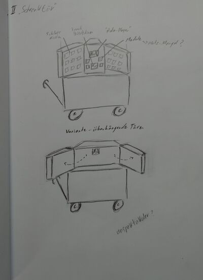 • Die Auswertung der ersten Zeichnungen, zusammengefasst in Tabelle 12, führte zur Entwicklung von drei Konzepten für die Escape-Box. Varianten mit einem aufklappbaren oberen Teil oder seitlich aufschwenkbaren Türen wurden aufgrund des hohen Platzbedarfs verworfen. Das dritte Konzept, eine untere Box auf dem Handpritschenwagen, erweist sich als besonders praktikabel. Der Deckel lässt sich über ein platzsparendes „Lift-Up“-Scharnier öffnen, sodass die Ablagefläche vollständig erhalten bleibt. Die ursprünglich geplante Integration von Modulen im Deckel wird zugunsten eines einfacheren und stabileren Aufbaus nicht umgesetzt.