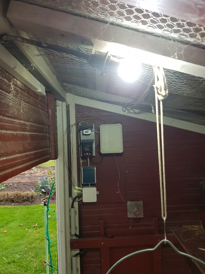 Als Vorinstallation wurde ein Stromanschluss mit mehreren Steckdosen im Stall angebracht. Ferner ist die Mechanik der Tür für ein manuelles Öffnen und Schließen eingebaut. Für die Lichtsteuerung befindet sich eine angeschlossene Tageslichtlampe im Stall. Das Ergebnis ist auf den folgenden Bildern zu erkennen.